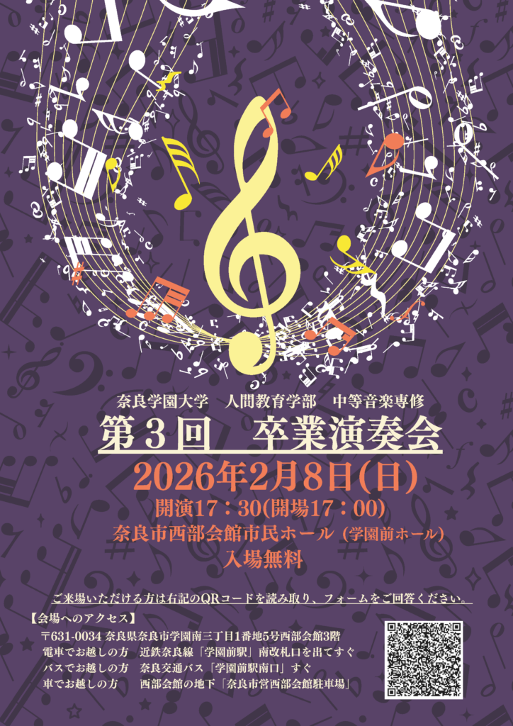 2026年2月8日(日)学園前ホールにて、奈良学園大学人間教育学部人間教育学科中等音楽専修第3回卒業演奏会を行います。