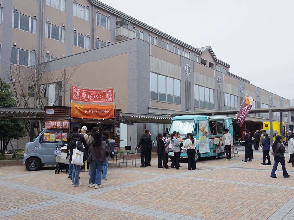 本学マーチングバンド部の演奏で幕を開けたフードフェス。人気フードのキッチンカー21店が集結し、見た目も可愛いスイーツやグルメが勢揃いしました。あちこちで行列ができるほどの盛況ぶりでした。