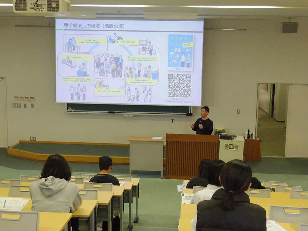 事前予約制のオープンキャンパスでは、各学部学科が趣向を凝らしたプログラムを展開しました。保健医療学部リハビリテーション学科では、医療現場にとどまらない豊富な職業選択やキャンパスライフについて紹介し、医療現場で活躍する卒業生も登壇しました。