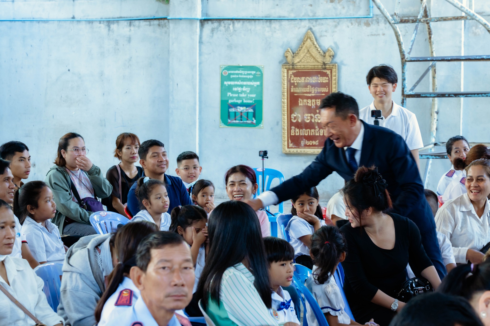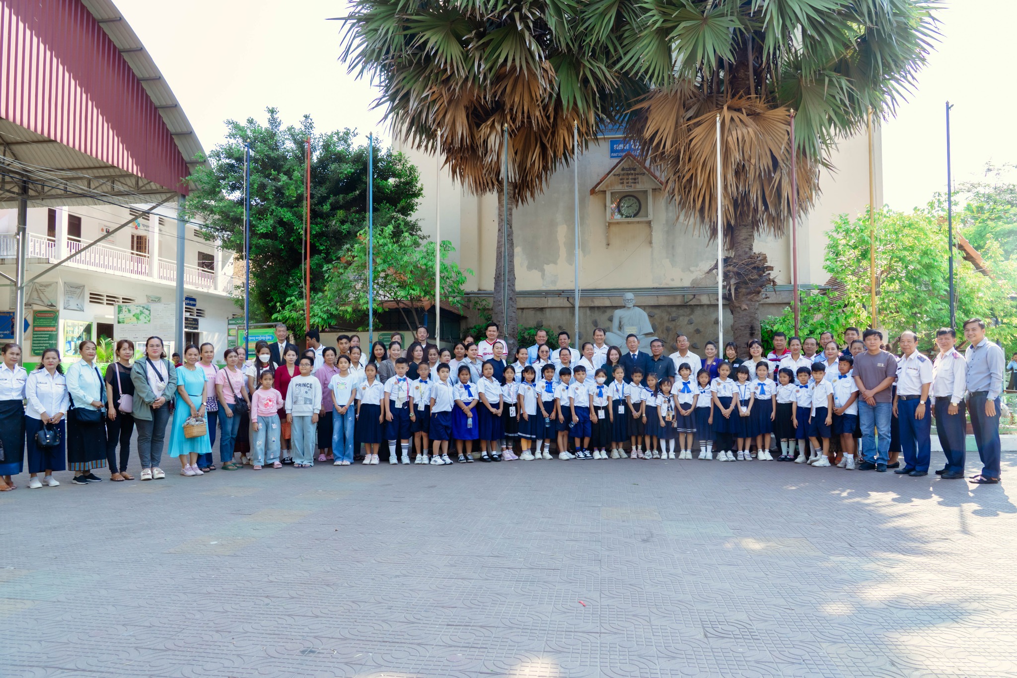 当日は、本学人間教育学部の松井典夫教授がプロジェクト責任者として出席し、プロジェクトチームとともに式典に臨みました。また、プノンペン市教育・青年・スポーツ局を代表して副局長Uk Chantha氏をはじめ、同局関係者、地区教育事務所長、学校長、教員、児童および保護者など、約100名の関係者が参加し、盛大に執り行われました。