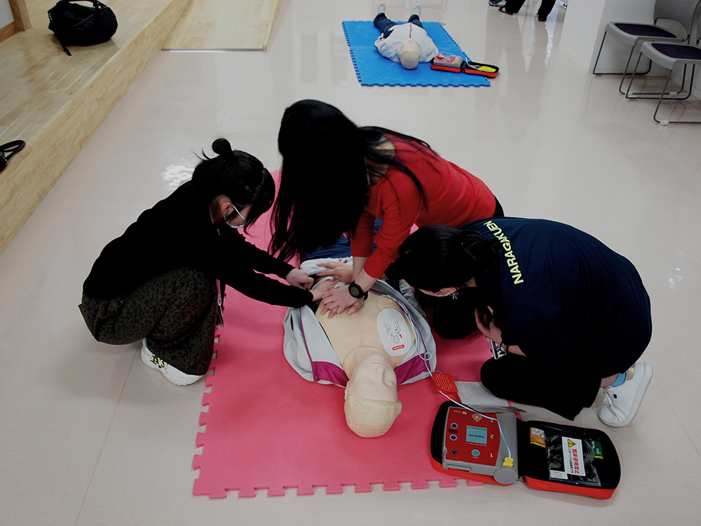 保健医療学部看護学科では、授業で使われているシュミレーター人形の心音を聞いていただいたり、AEDを使った心肺蘇生術など体験をしていただきました。