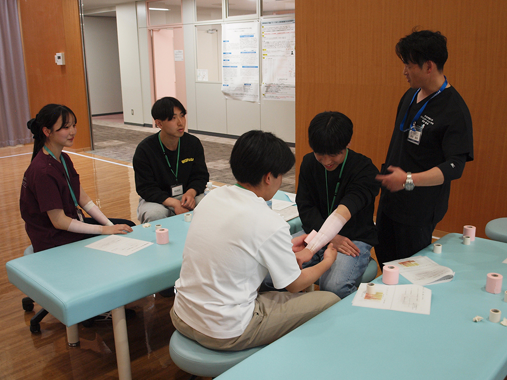 リハビリテーション学科では、作業療法で行われている革細工、スポーツトレーナーが行うテーピングの基礎など、参加者の皆さんにさまざまな体験をしていただきました。
