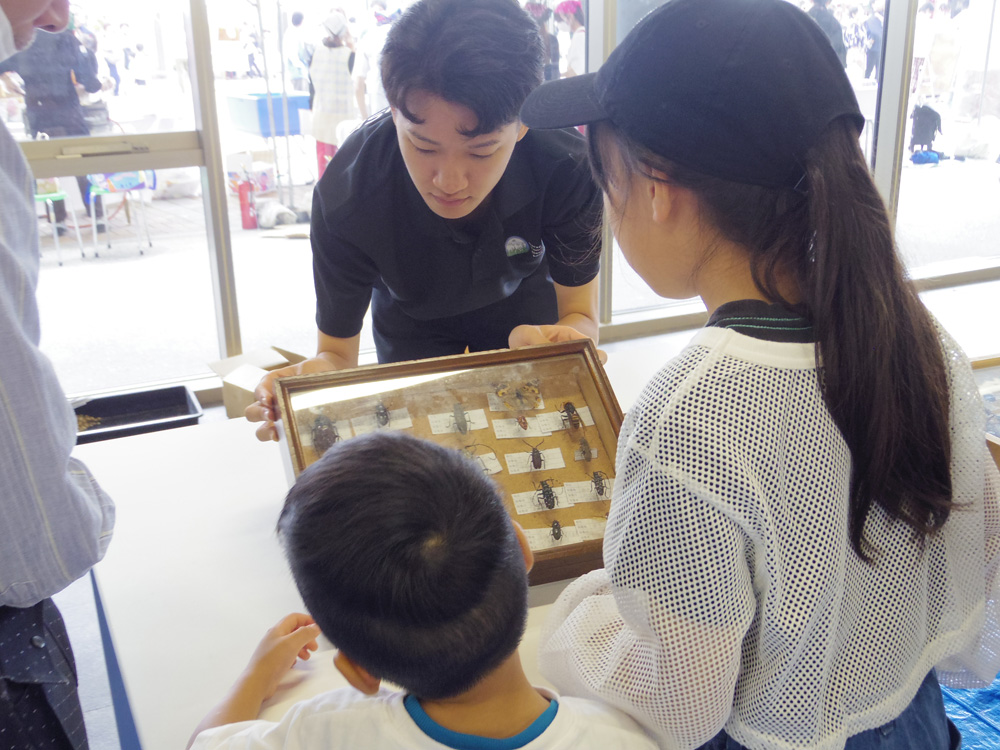 自然再生研究会は標本や水槽を展示し、来場者に木津川水系の生物について説明していました。