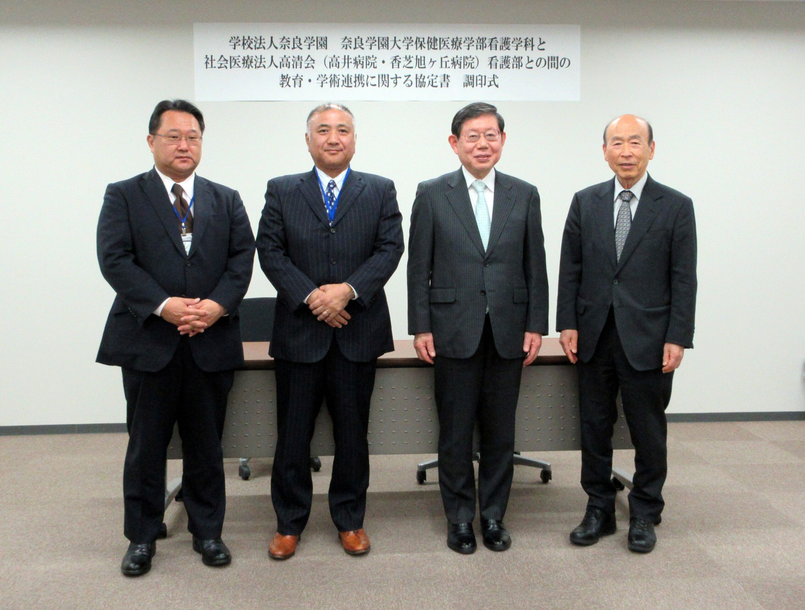 令和7年11月19日(水)、奈良学園大学1号館会議室にて、「奈良学園大学保健医療学部看護学科と社会医療法人高清会(高井病院・香芝旭ヶ丘病院)看護部との教育・学術連携に関する協定書」の調印式を執り行いました。