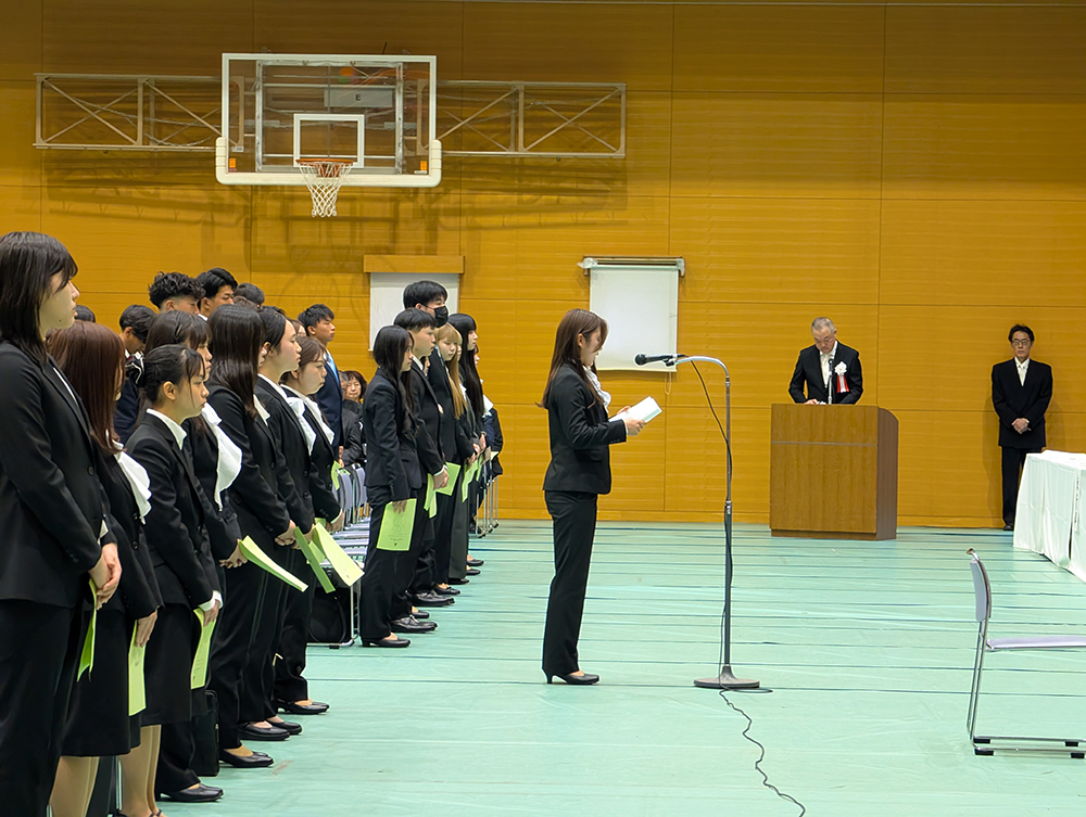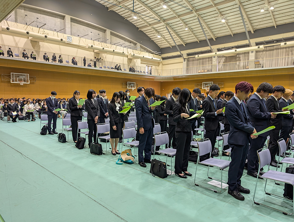 在校生の代表からは、「失敗を恐れず、多くのことに挑戦し、実りある大学生活にしてください。」と、エールが贈られました。そして、式典参加者全員で学歌斉唱が行われ、入学式は閉じられました。