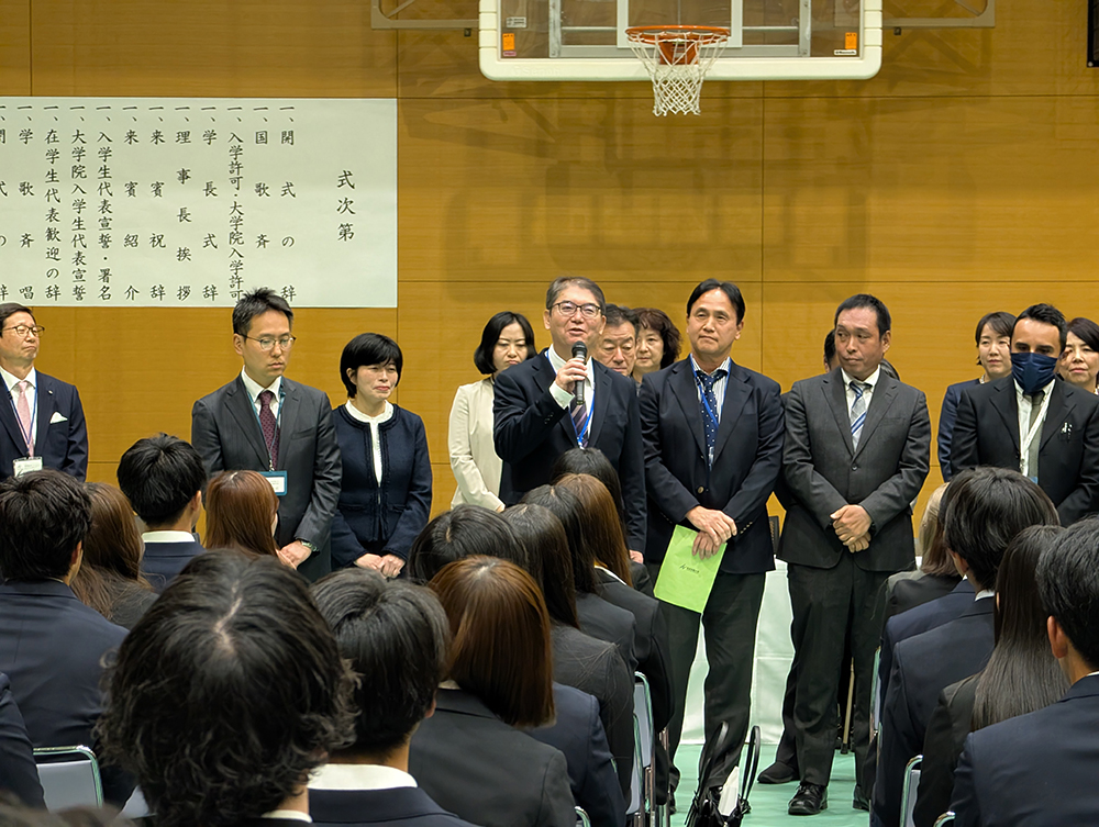 金山学長から、「現在、一部の仕事はAIに置き換えられつつあります。そのような中で、奈良学園大学で学ぶ医療や教育の分野などの現場では、人と関わる力が求められます。人を思い、気持ちを汲み取った対応は人間だからこそできることです。本学の建学の精神と高度な専門知識に裏付けされた、人を支えることができる人材に成長するよう、これからの大学生活を有意義に過ごしてください。」と式辞がありました。