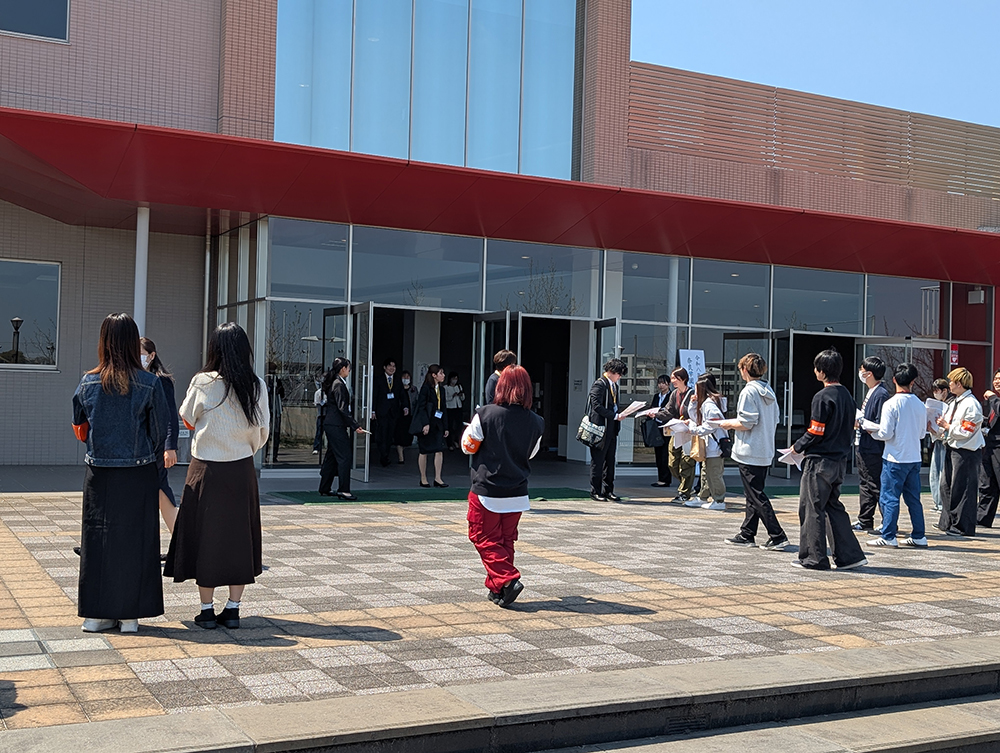 式典終了後、会場の外ではマーチングバンド部をはじめ、各部活動やサークルの勧誘を先輩たちが行い、新入学の学生達と笑顔で交流していました。