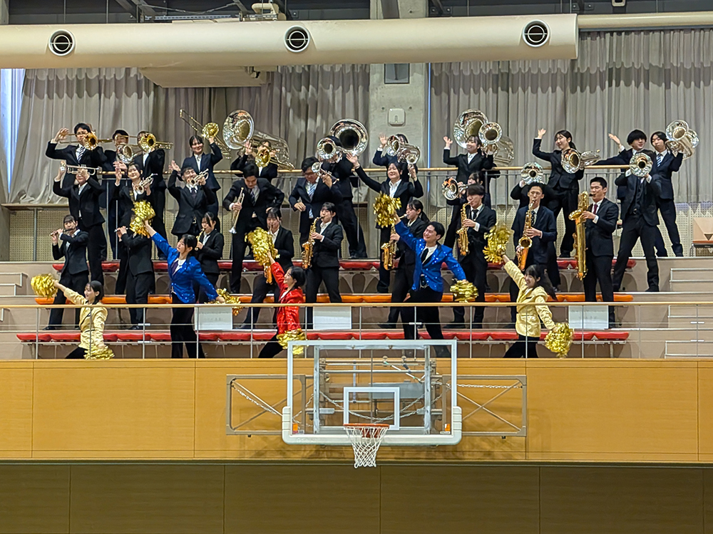 休憩をはさんで、本学のマーチングバンド部がアリーナの2階席から、新たな一歩を踏み出す新入生への歓迎の演奏を行い、各教員が自己紹介を行いました。